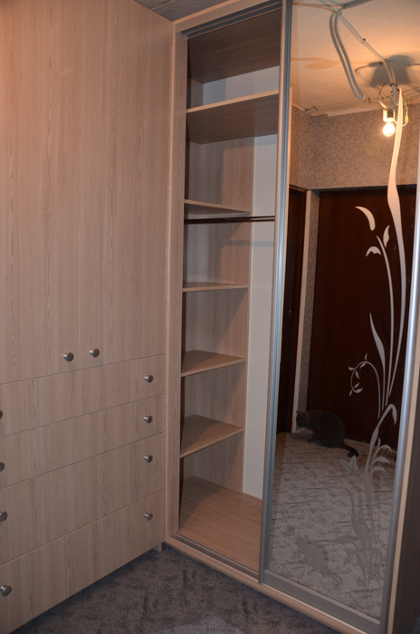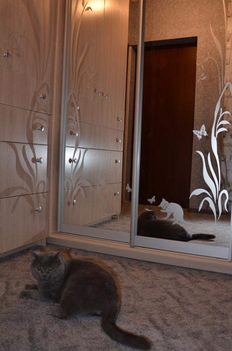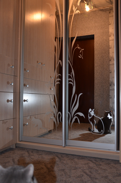 Кот оценил. У него теперь на шкафу дозорный пункт. А что? Всех и вся видно, кто куда пошел. Вот только ни залезть туда сам ни слезть он не может. Может и правда по стенке шкафа пустить ковролин и пусть по нему карабкается.