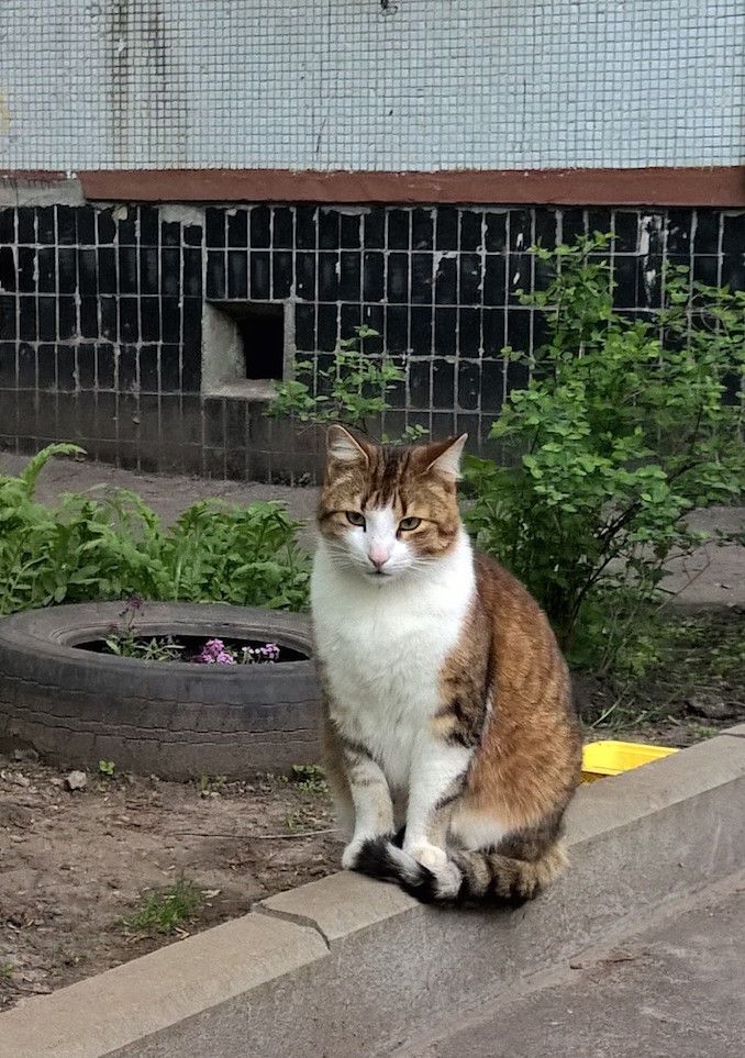 Встретила кошачье семейство, что живет в нашем дворе. Оно было в полном составе. Какие же они красивые! Я как-то уже показывала фото одного из котов. Он огромный! Мне кажется он раза в полтора больше нашего. Вот они.