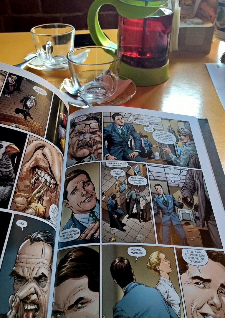 А потом поехали в город искать магазин комиксов. Муж на днях бродил по центру и на какой-то улице на него наткнулся. Вот я и предложила в него съездить. Хоть я комиксы и не люблю, но очень нравился магазин в сериале ТБВ. С трудом его нашли, накружили много пока искали. Маленький магазинчик, выбор тоже не большой. Но уже хоть что-то. Муж купил себе одну книжку. Дорого конечно, но качество мне очень понравилось! И бумаги и рисунков. Рисунки даже кое-где разной краской нанесены чтоб получился эффект объемности.