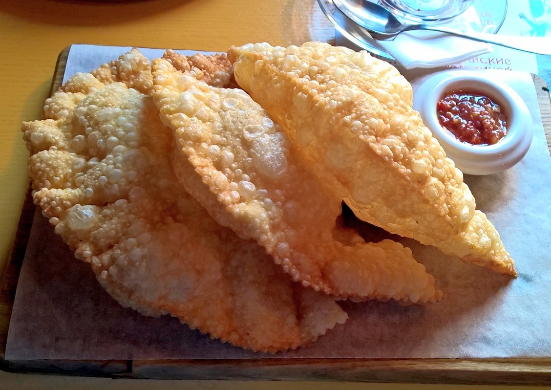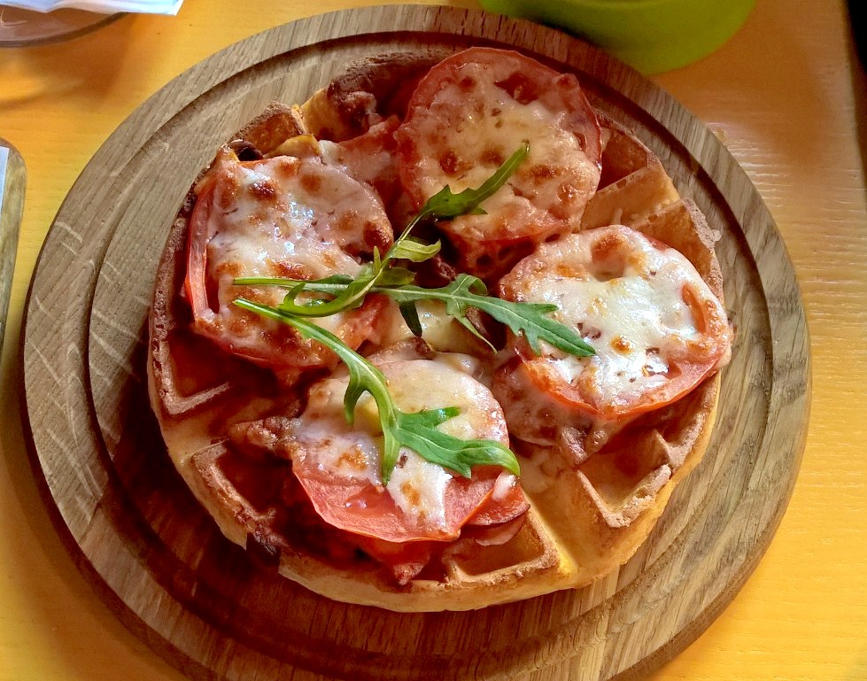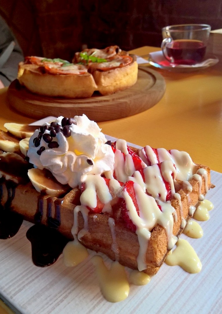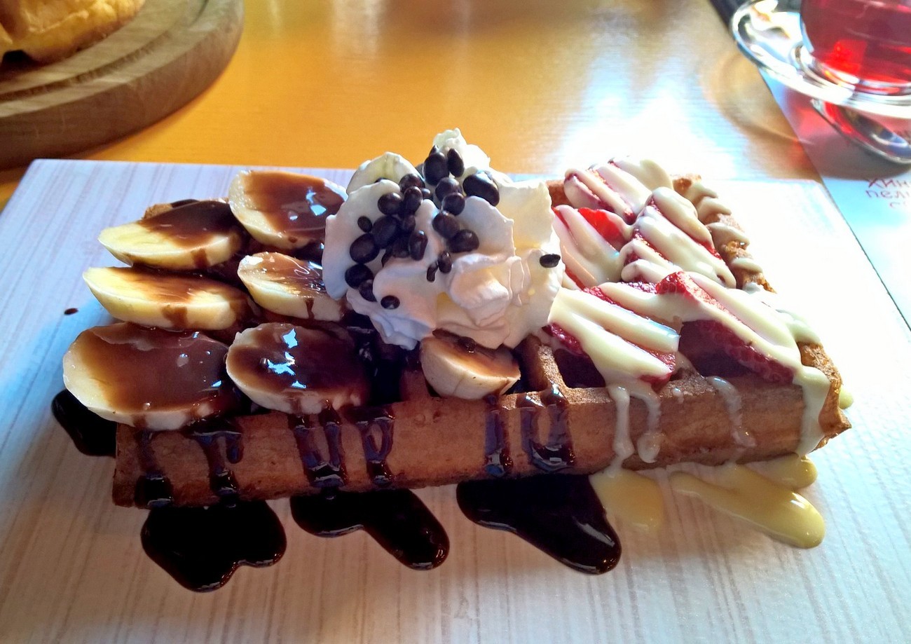 И пошли к моим любимым вафлям! Как же давно я их хотела! В придачу к ним муж заказал чебуреки (одну порцию на двоих). Оказались очень вкусными, с правильным тестом, что встречается крайне редко. Я как обычно, сладкую вафлю (бананы, клубника, сливки, черный и белый шоколад), а муж мясную. (Все сегодняшние фото телефонные)