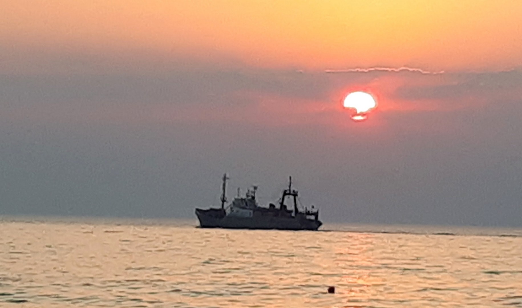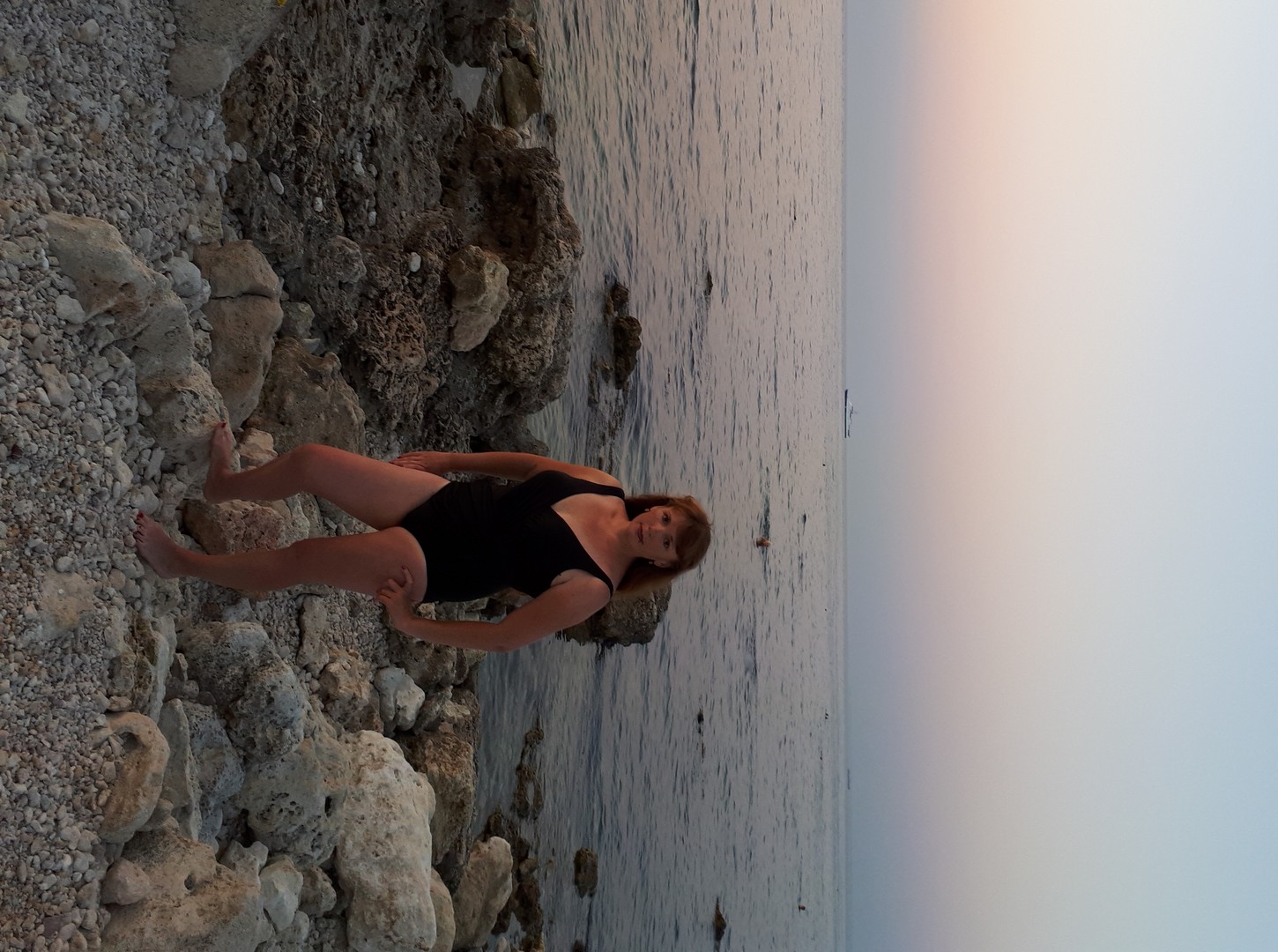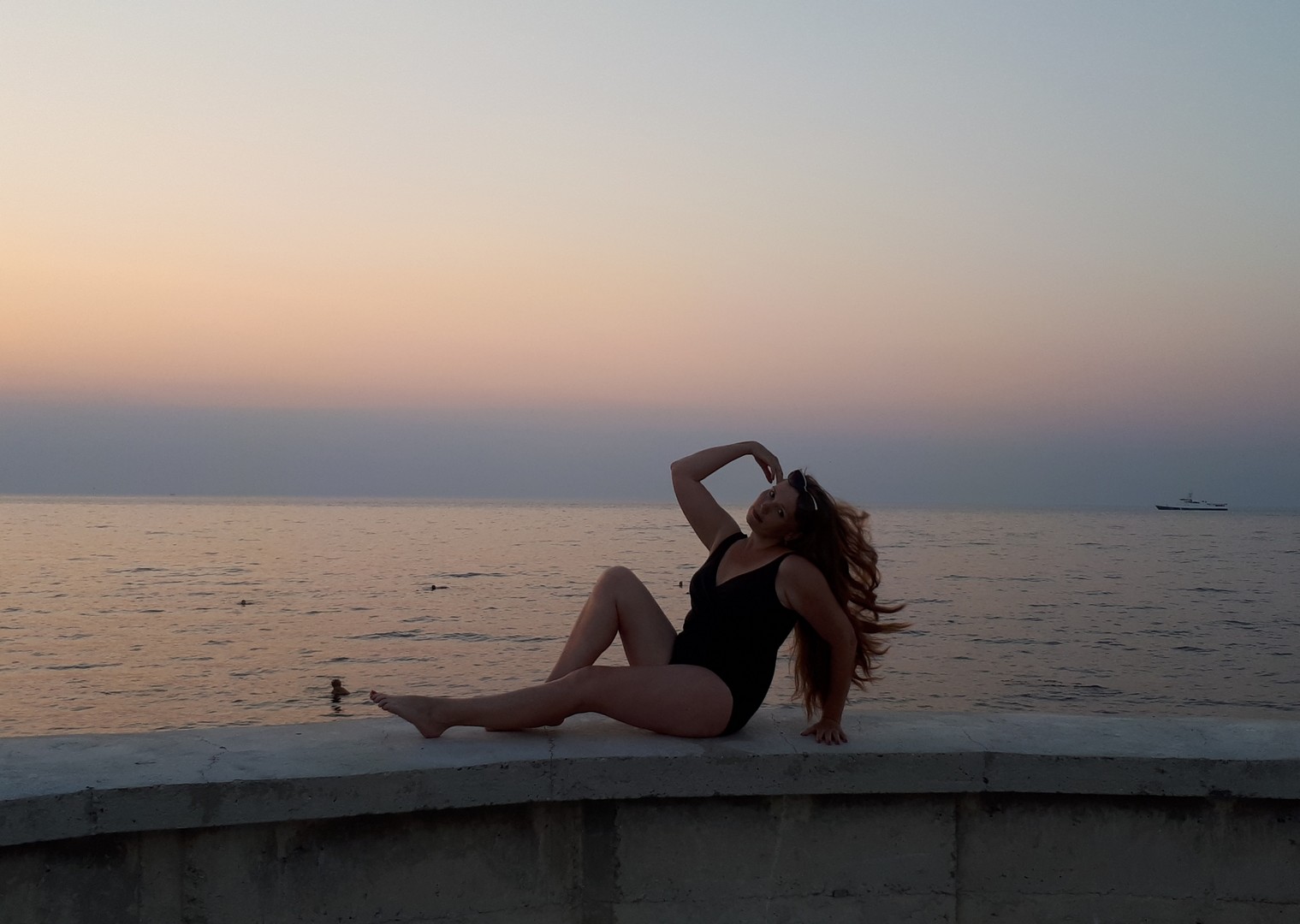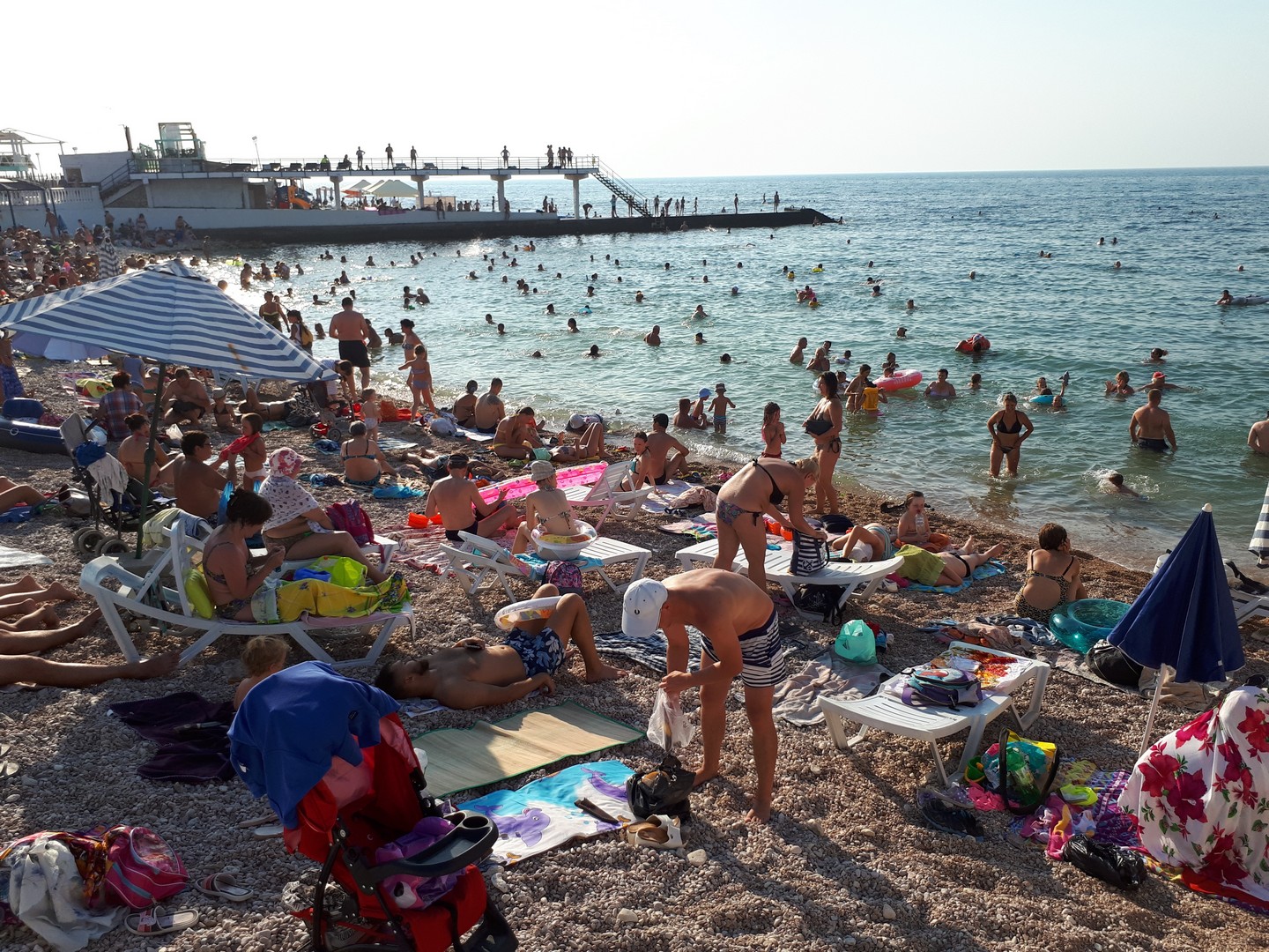 В 5 вечера в душной маршрутке, где все стоят по стойке “смирно” поехали на ближайший пляж. Он автобуса еще 1 км идти до моря. В парке тенька нет, все по солнцу. На пляже яблоку негде упасть. Кое-как нашли куда примостить пакет и обувь.
