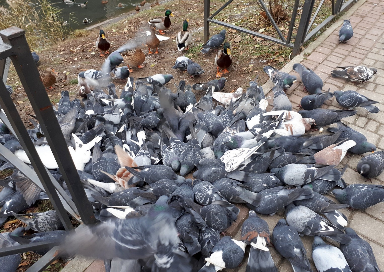 Голуби накинулись на пшено, расталкивая друг друга. Зато дали возможность уткам подойти за хлебом. А то они вышли из воды, но как-то стеснялись подходить. А голуби наглые – видят еду у людей и кидаются выравают прямо изо рта!