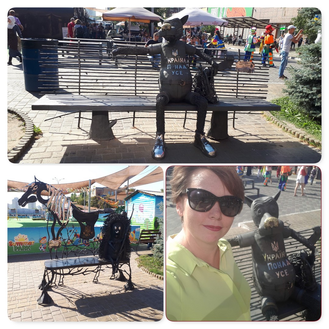Сев в 7 утра в поезд к полудню мы были уже в Киеве. Сразу после заселения в квартиру, кстати очень удобная и комфортная, всего в 0,8 км от ж/д вокзала, вооружившись фотиком, мы поехали на Comic Con. Увидев очередь на вход стало немного грустно. Очередь петляла по залам тогрового центра, возвращалась в исходную точку и конца ей видно не было. Пока стояли в очереди люди успевали походить по могазинам, сделать покупки, поесть, попить. Я выходила на улицу посмотреть что там. Видела вот такие интересные скамечки.