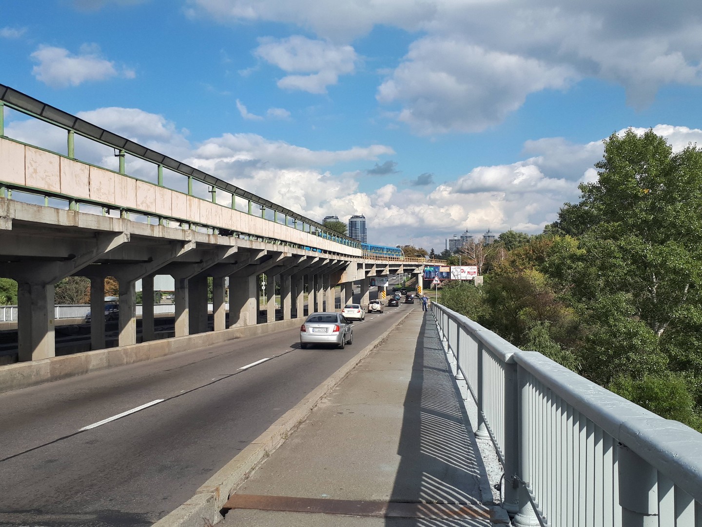 Все бы хорошо, да только окончание моста утыкается в проезжую часть с ужаснейшим движением без всяких переходов. Немног покружив и ничего не найдя типа пешеходного или подземного перехода пришлось идти по газону вдоль дороги. По-дурному конечно сделано! Мы-то надеялись что дальшле что-то будет. Не тут то было! Дальше метро, а вход в него на другой стороне дороги. В итоге пришлось нестись через несколько полос чтоб тебя не сбили. Вот не могут все нормально продумать!