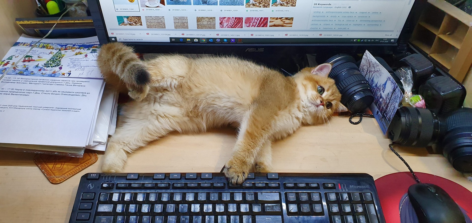 Везде ходит за нами хвостиком! Мы на диване – он под столом рядом, мы за компами – он на клавиатуре, мы в спальне – он на тумбочке чтоб нас видеть. На кухню бежит спотыкаясь и падая когда мы туда идем.